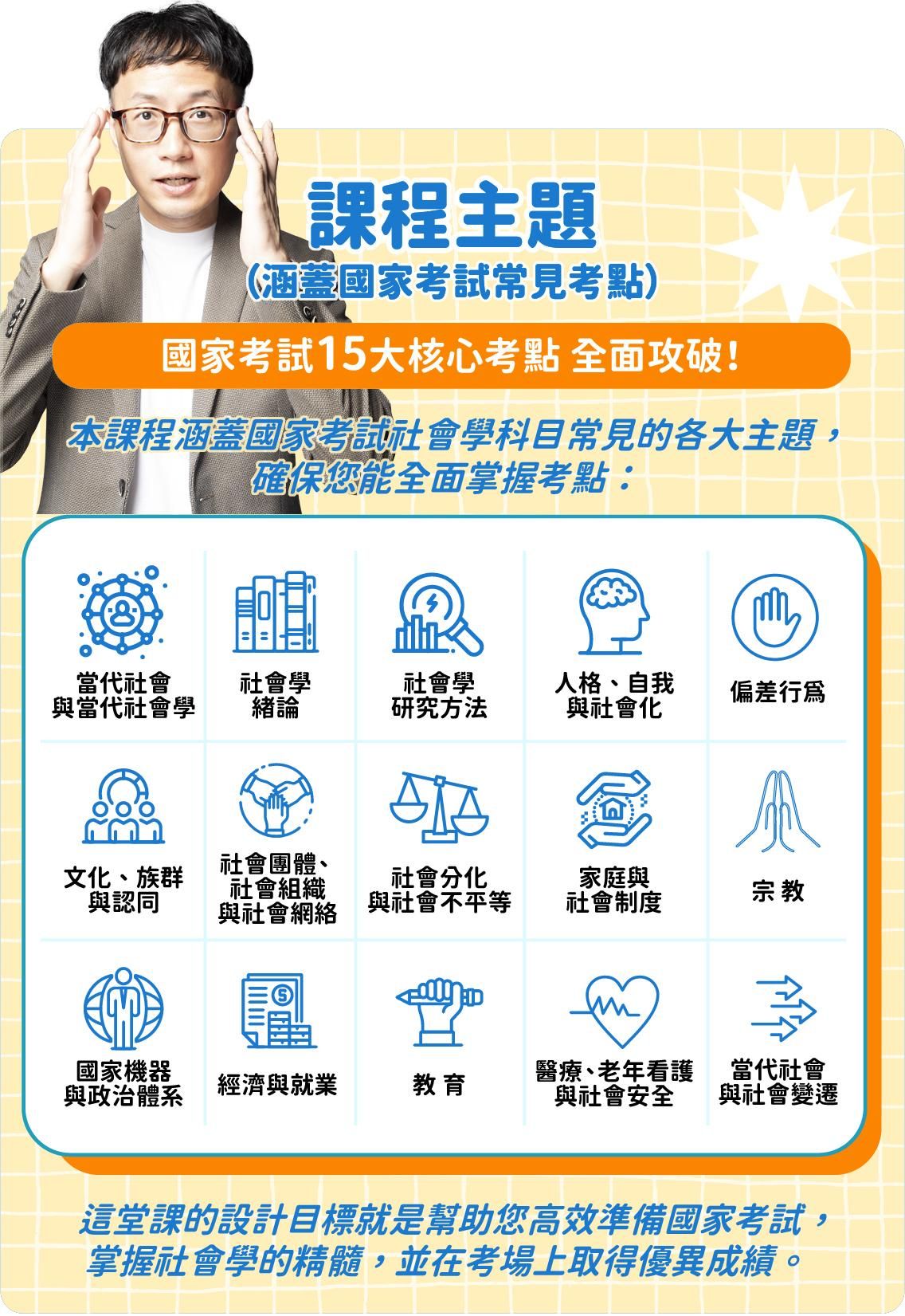 👥新學員:如果您是首次接觸國家考試社會學科目,或需要一個完整、系統性的課程來打下扎實基礎,這門課將是您的理想選擇。
