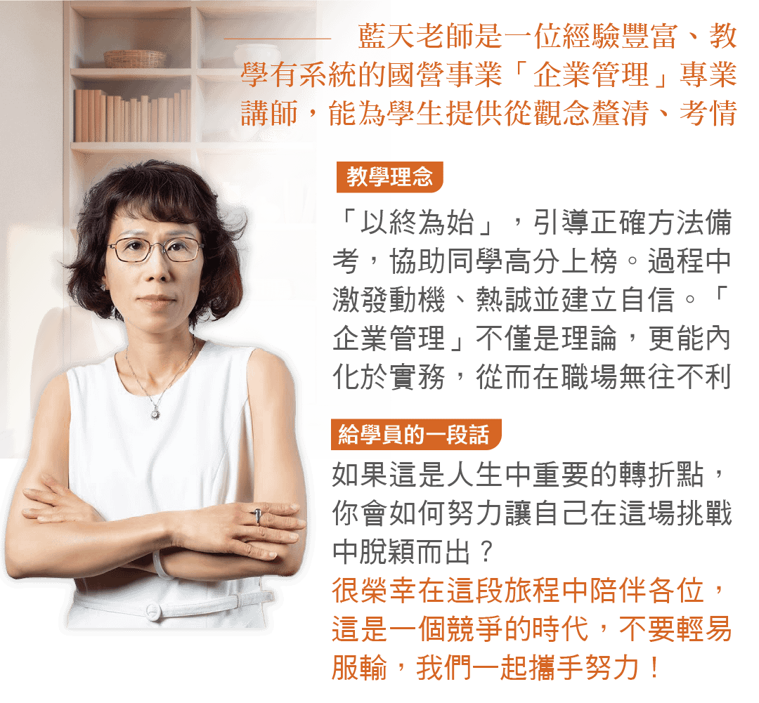 藍天老師的「企業管理速刷快解」課程是一套結合高頻考點精講、應考策略與實戰技巧的全方位課程。