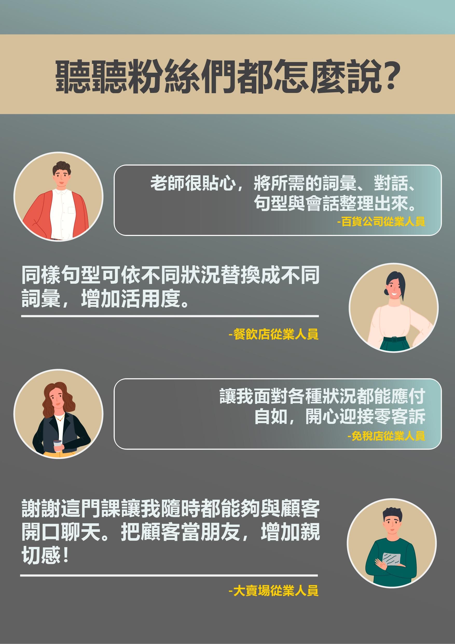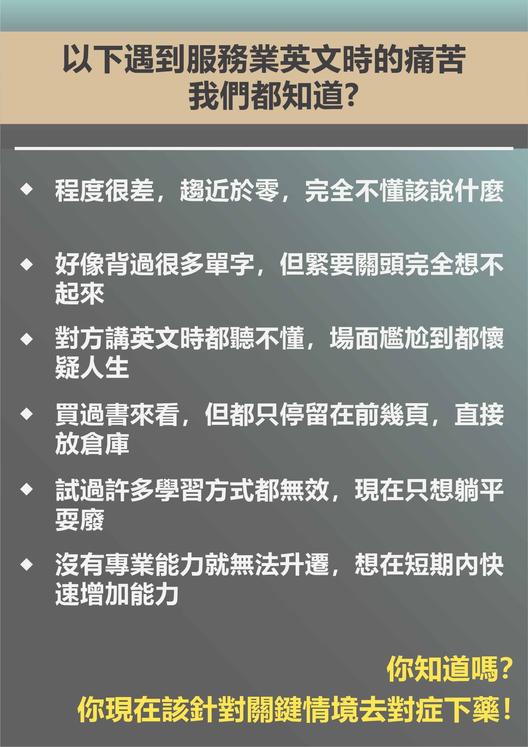 服務業英語是學習服務業英語的最佳選擇。課程內容全面、實用,讓您在服務業工作中成為最自信、最有智慧的溝通者!