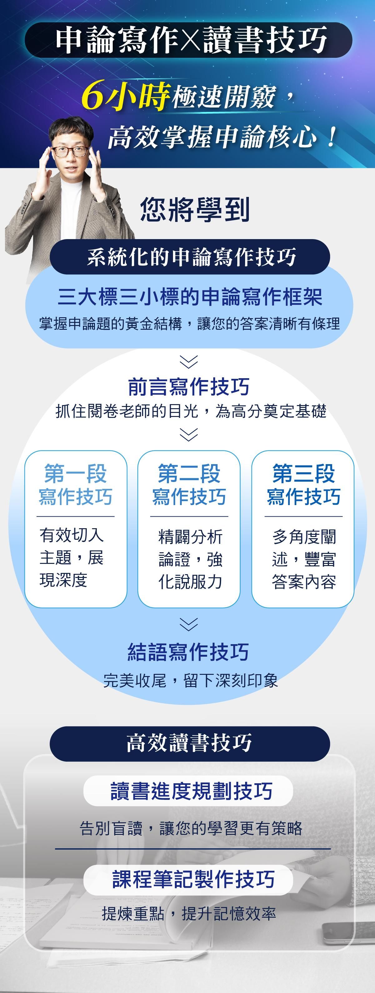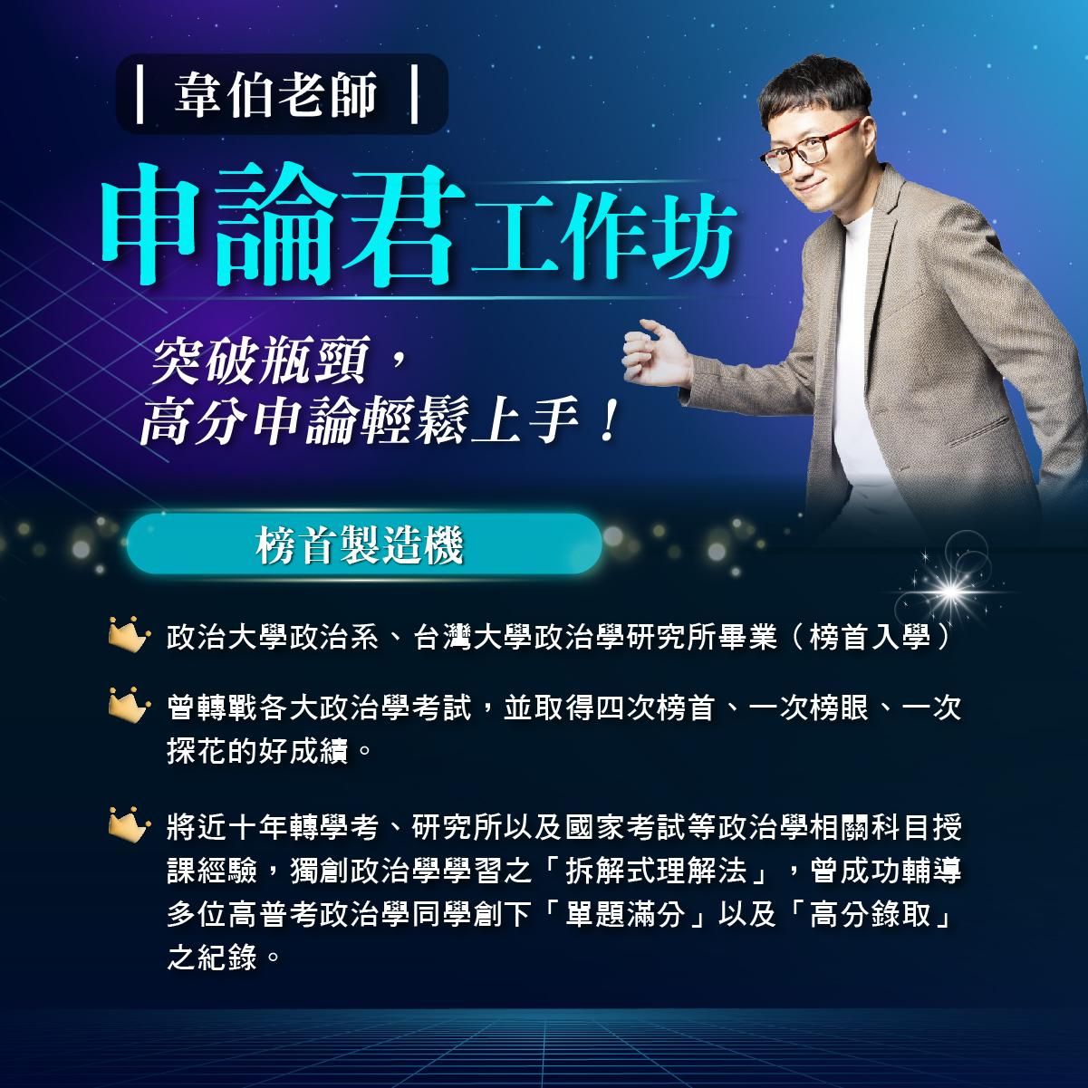 想在國考中脫穎而出,申論題是關鍵!「申論君工作坊」由韋伯老師親自授課,專為渴望提升申論寫作與讀書技巧的國考生打造。