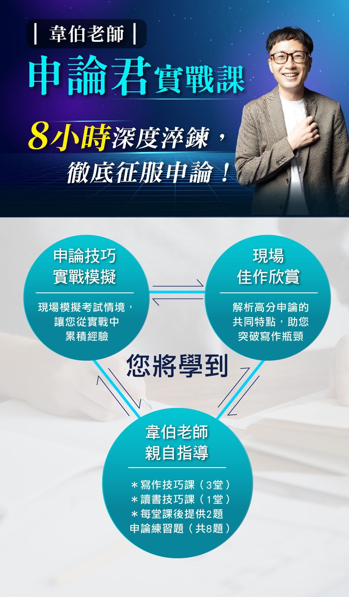 「申論君實戰課」這不僅是一堂課,更是一場實戰特訓,由申論名師韋伯老師親自指導,帶您從理論走入實戰,徹底突破申論瓶頸! 這是一場真正能讓您將所學轉化為實戰能力的課程。