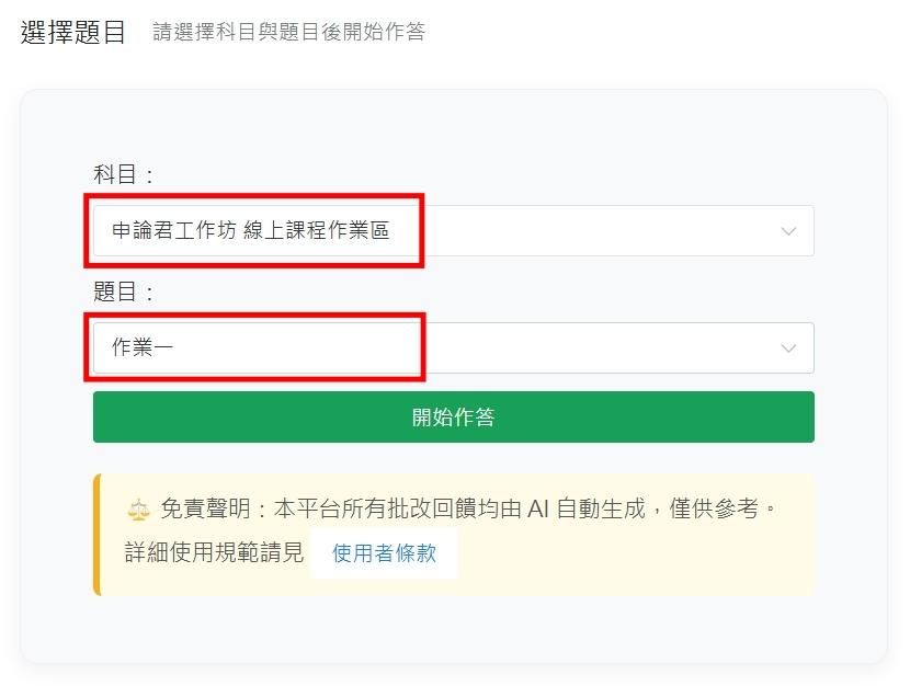 (3)選擇科目與題目後「開始作答」。