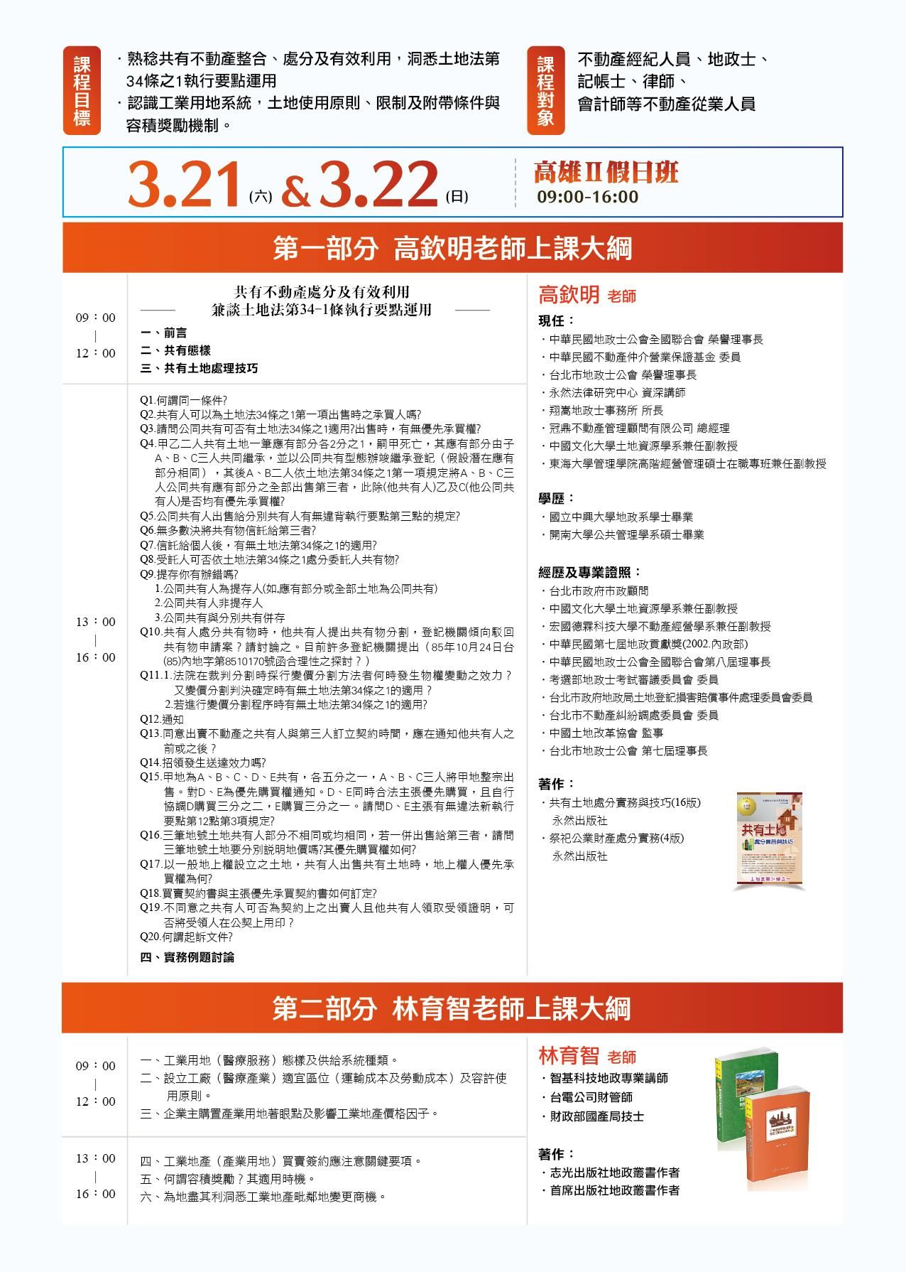 課程重點2:攻克共有土地開發的法律深水區。 以《土地法》第 34 條之 1 為核心,透過 20 個實務最常遇到的核心 QA,徹底拆解公同共有、分別共有在處分、提存、送達及優先承買權行使中的種種爭議。課程將直擊「裁判分割與多數決處分衝突」、「招領送達效力」及「法院變價分割」等專業難點,確保您在處理複雜產權時能精準避雷、合法達標。