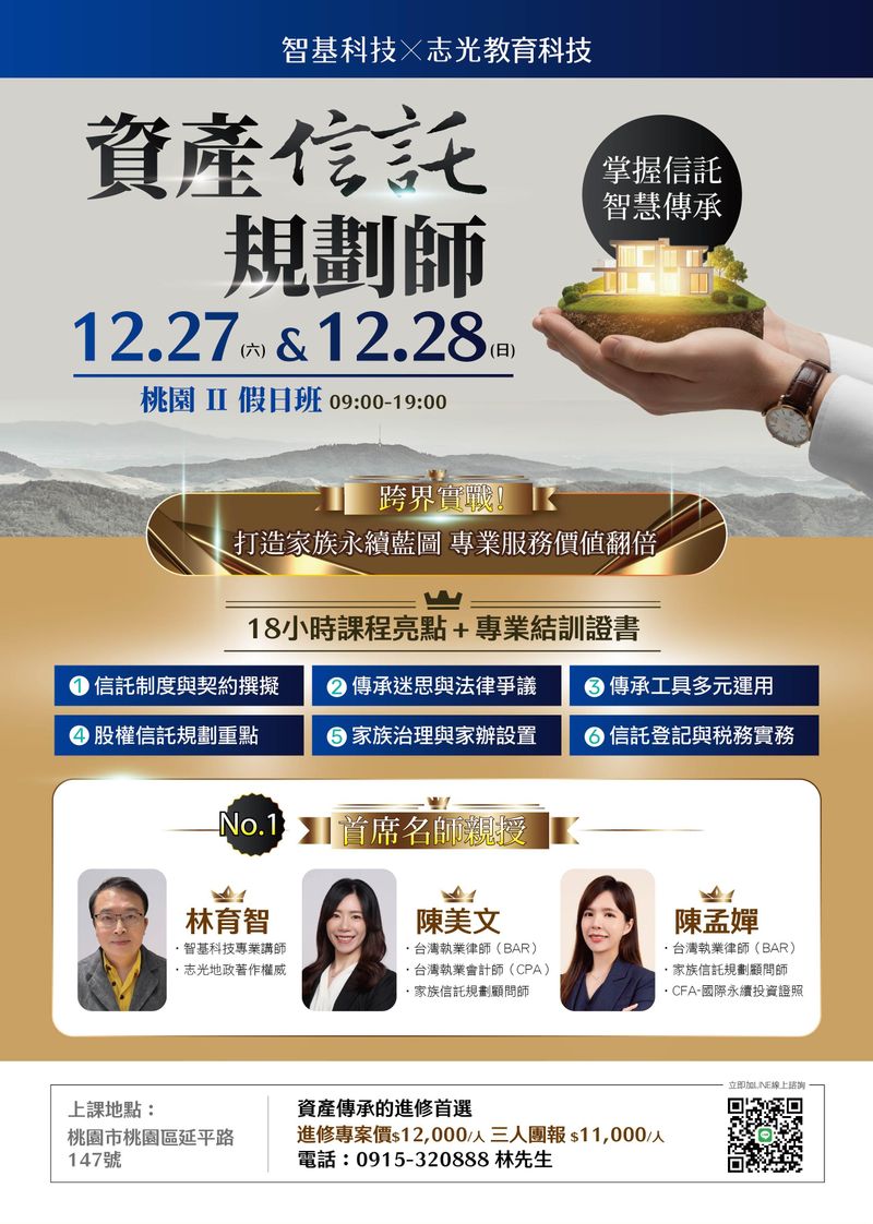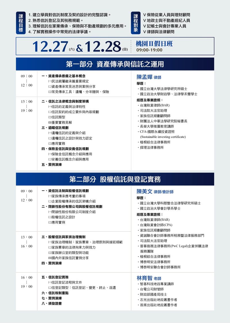 09:00 | 12:00 | 一、信託的法律概念與制度架構 (一)信託的定義與法律特性 (二)信託契約的成立要件與內容規劃 (三)信託類型 1.民事信託 vs. 商業信託 2.自益信託vs.他益信託 | 林育智 老師 |