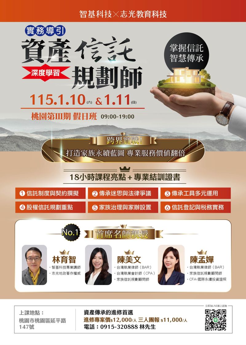 破解家業傳承的法律爭議與稅務迷思!本課程專為專業人士打造,整合信託法制、登記實務與財管觀點,精通不動產、保險金信託規劃,立即掌握關鍵實戰技能。