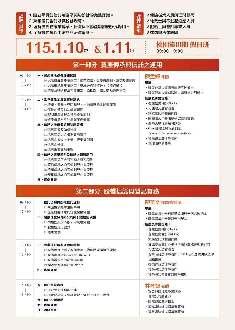 本課程為跨專業進修課程,整合法律、稅務、登記與財管觀點,協助學員掌握信託制度於家業 傳承上的實務運用。