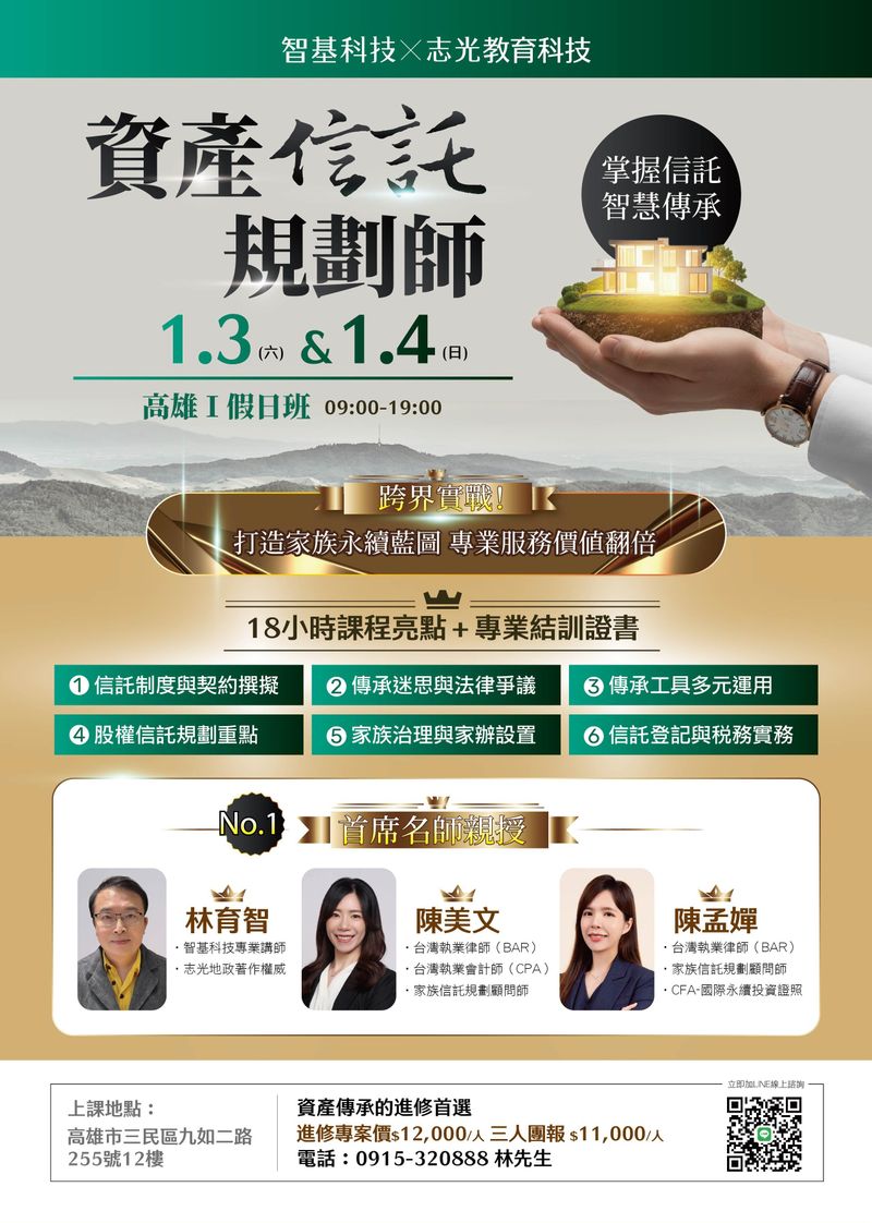 破解家業傳承的法律爭議與稅務迷思!本課程專為專業人士打造,整合信託法制、登記實務與財管觀點,精通不動產、保險金信託規劃,立即掌握關鍵實戰技能。
