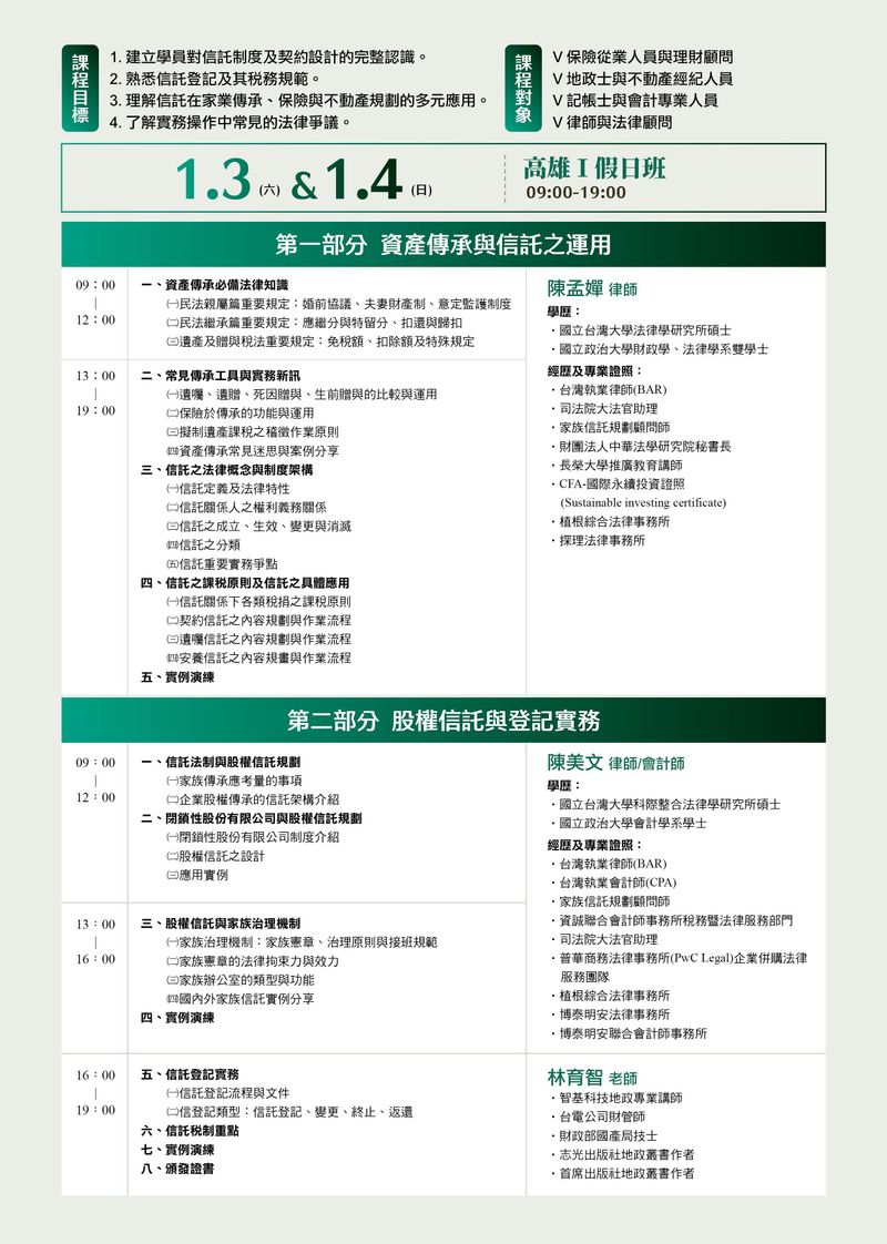 01/03、01/04資產信託規劃師【家業傳承 x 信託實務】高雄Ⅰ假日班