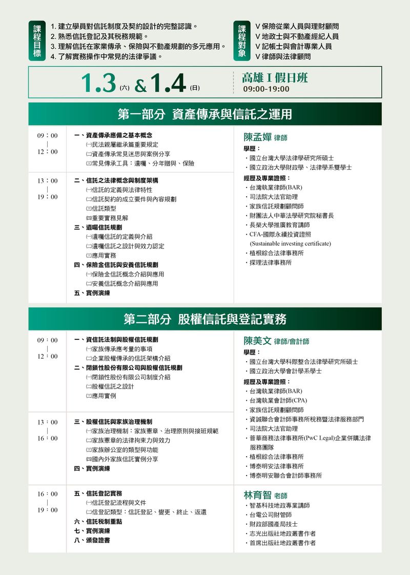 09:00 | 12:00 | 一、信託的法律概念與制度架構 (一)信託的定義與法律特性 (二)信託契約的成立要件與內容規劃 (三)信託類型 1.民事信託 vs. 商業信託 2.自益信託vs.他益信託 | 林育智 老師 |