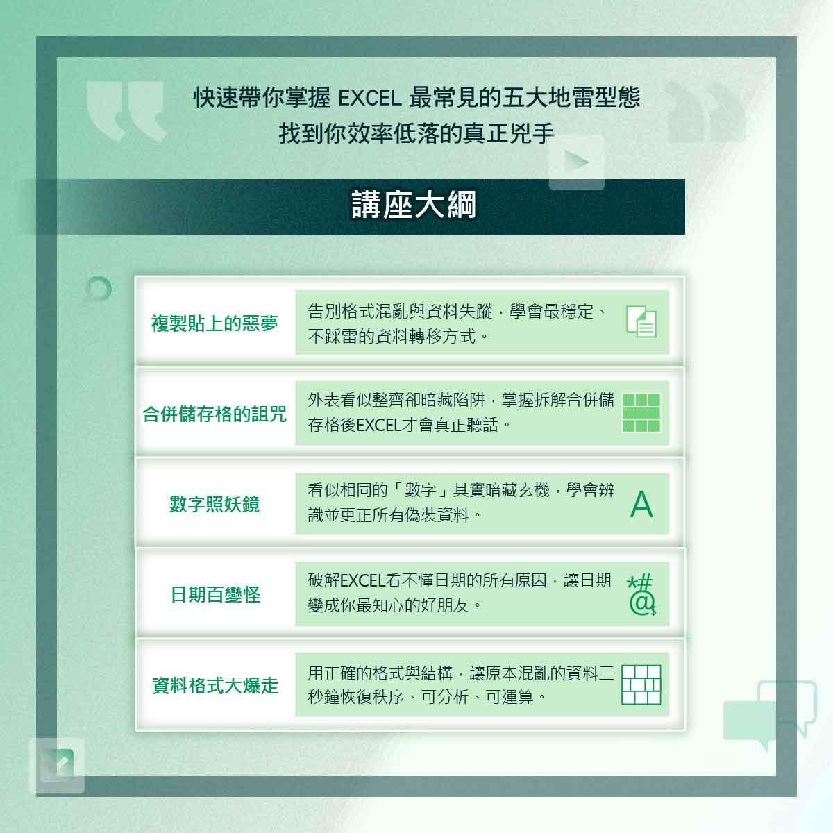 這堂「EXCEL 職場避雷術」將帶你親手拆除辦公室 5 顆最致命的地雷,學會真正能被分析、被應用的資料整理術,原來不用學一堆技巧,只要觀念正確效率直接翻倍