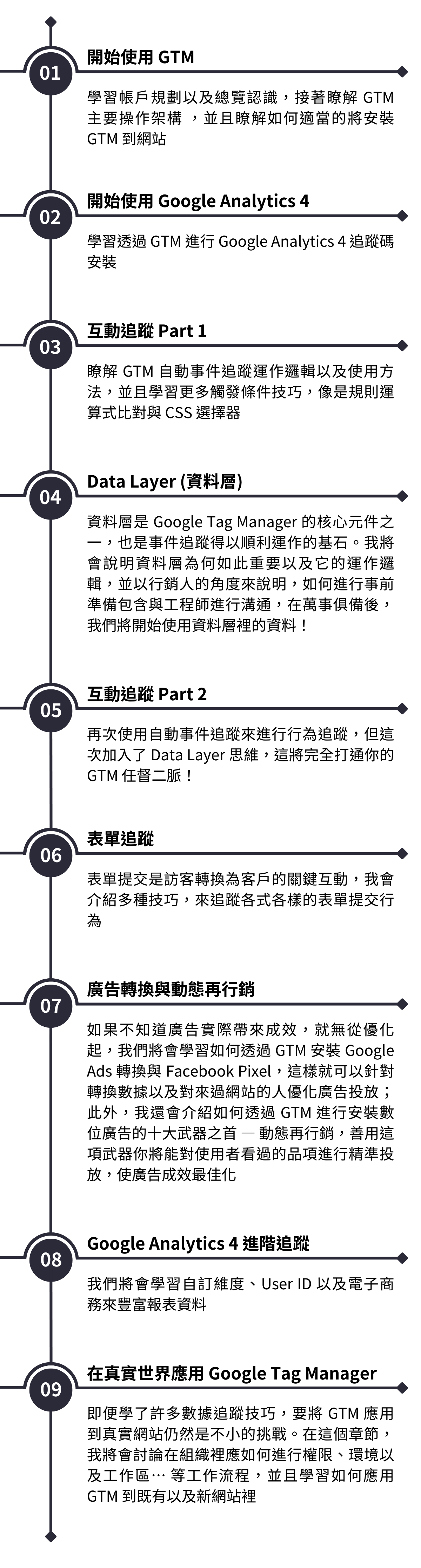 - 約 7 小時影片內容,循序漸進學習各種數據追蹤情景以及實戰技巧。