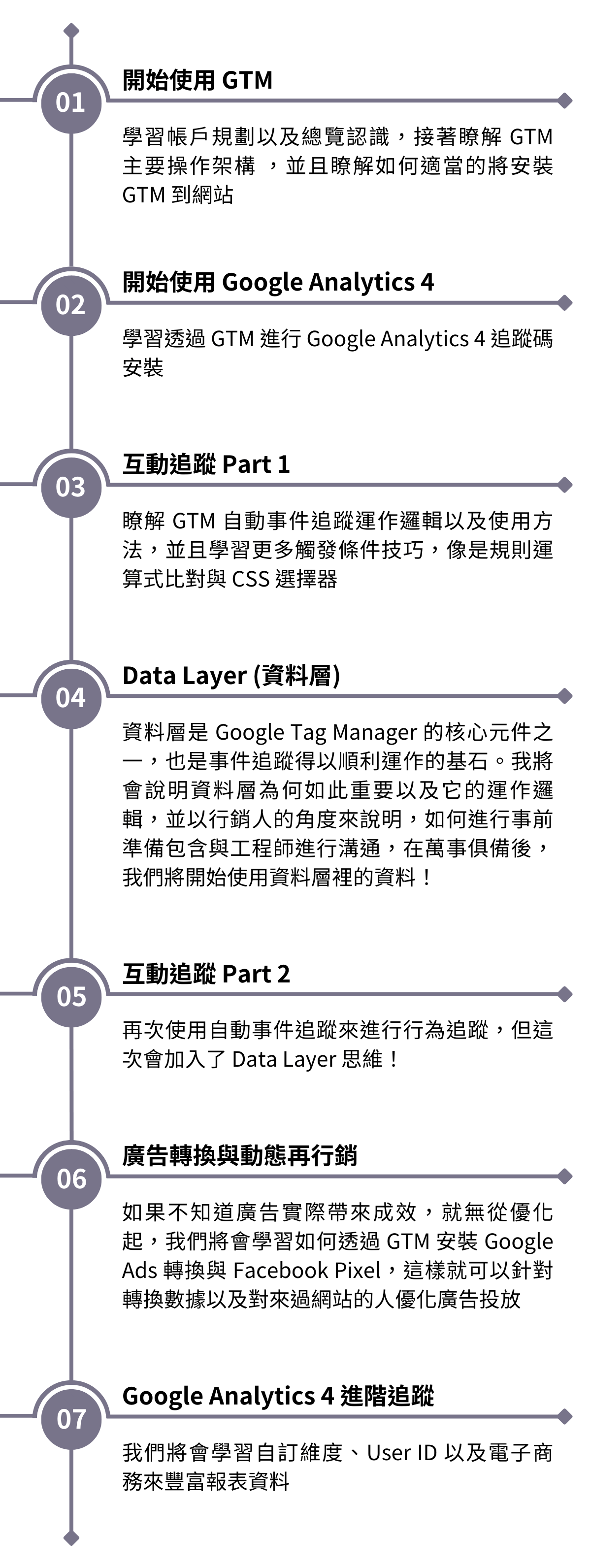 - 180 分鐘影片內容,包含開始使用 GTM 的一切所需到常見廣告轉換應用。