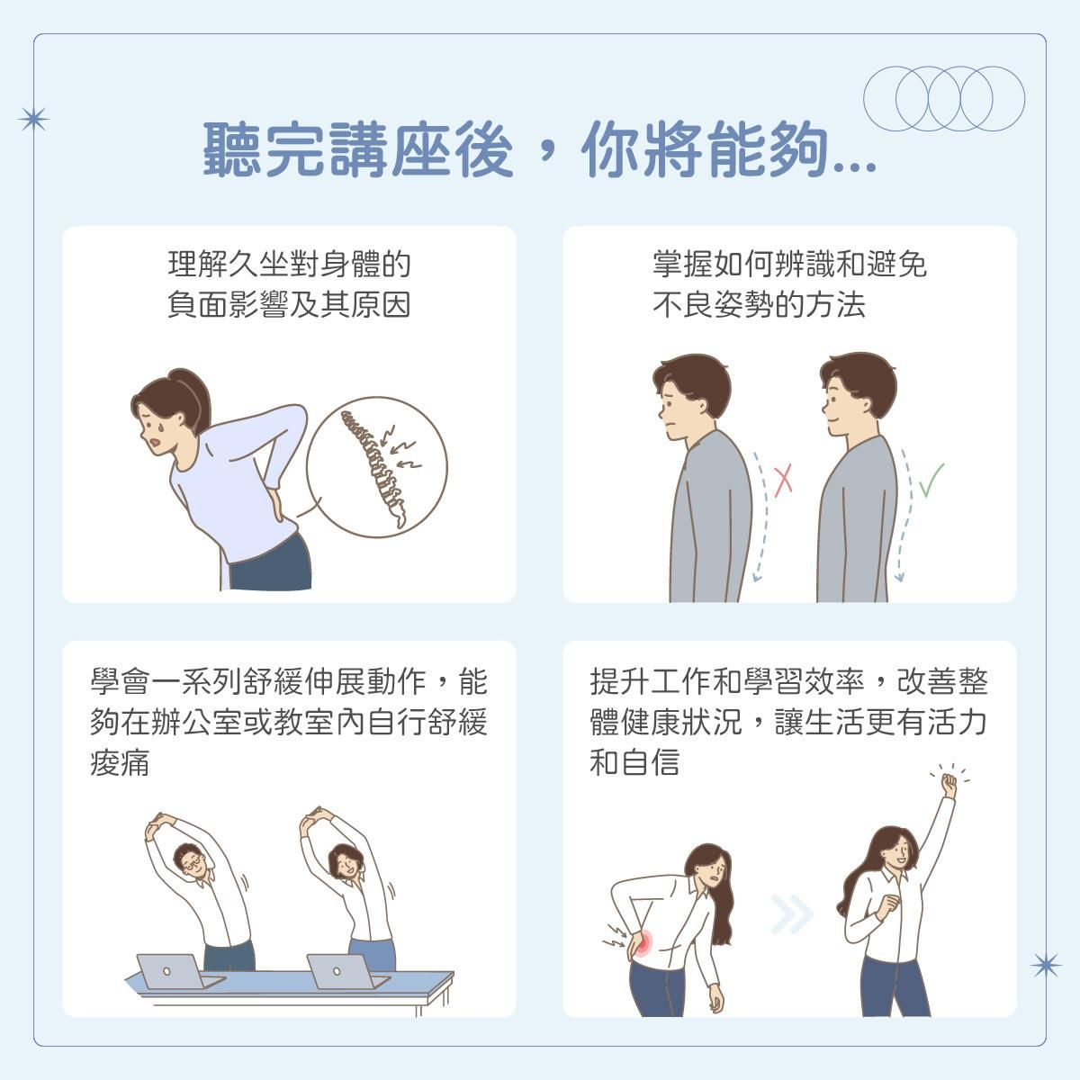 本講座旨在幫助學生與上班族終結因長時間久坐而引發的肌肉僵硬、肩頸痠痛、下背痛等各種酸痛問題。通過分享常見久坐及低頭姿勢導致的緊繃痠痛問題,並介紹簡單易行的舒緩伸展動作,讓參與者能在辦公室或教室內輕鬆改善不適感,提升工作與學習效率。