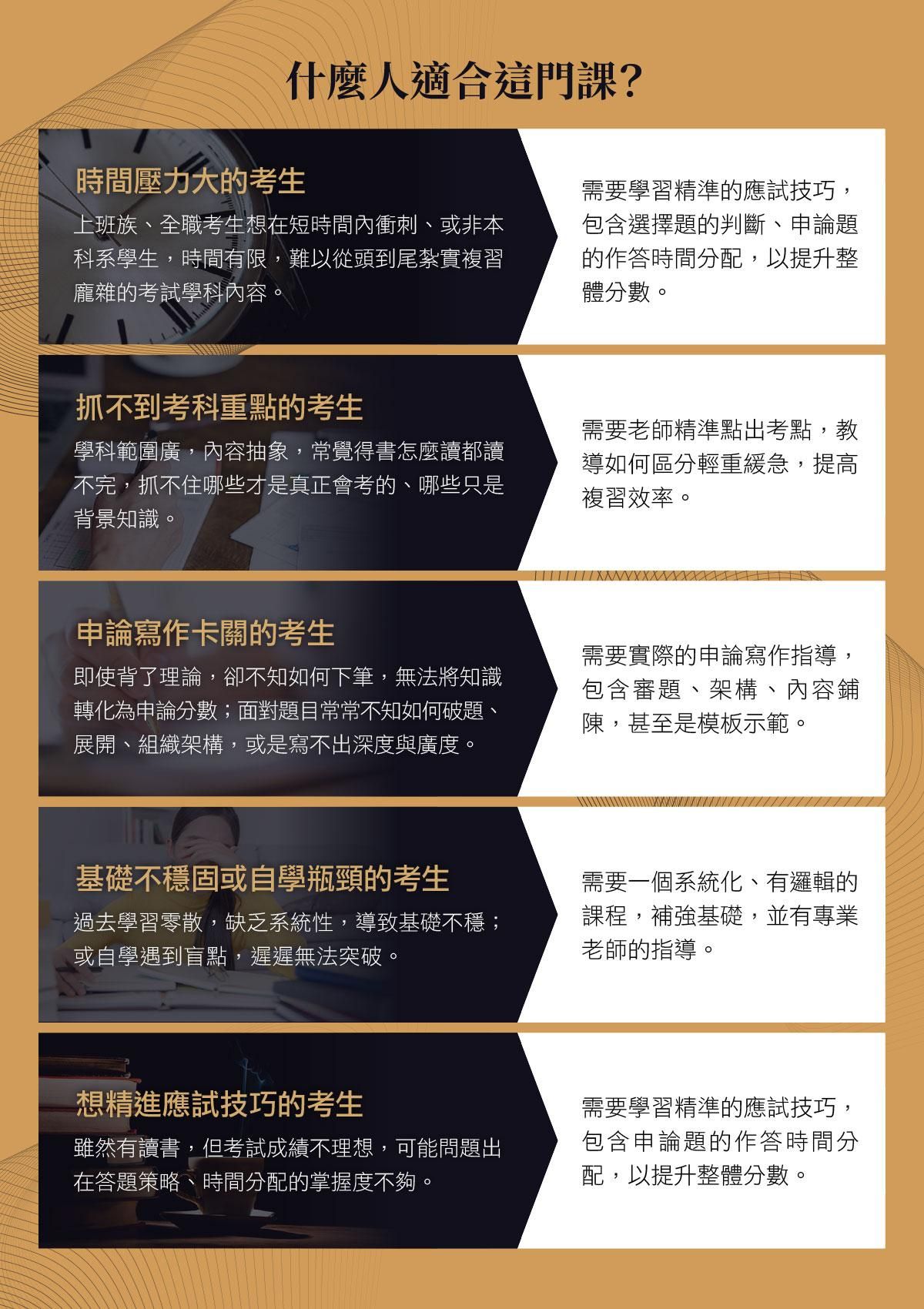 這門課能讓考生用更少的時間,掌握到更多得分關鍵,從「不知道怎麼讀」到「精準得分」,最終實現上榜的目標!