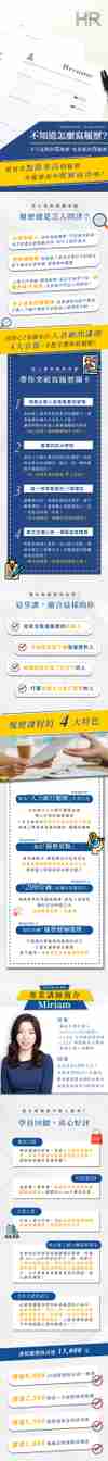 國內第一堂專業人資設計的履歷技巧教學課程,帶你一窺企業人資每天撈履歷跟面試的習慣,讓你知彼、投其所好,認識篩選履歷的人、面試官對於履歷的要求,這堂課不只是教你寫履歷,也要幫你改履歷,課程觀看後可提交履歷給Miriam,Miriam會提供文字修改建議