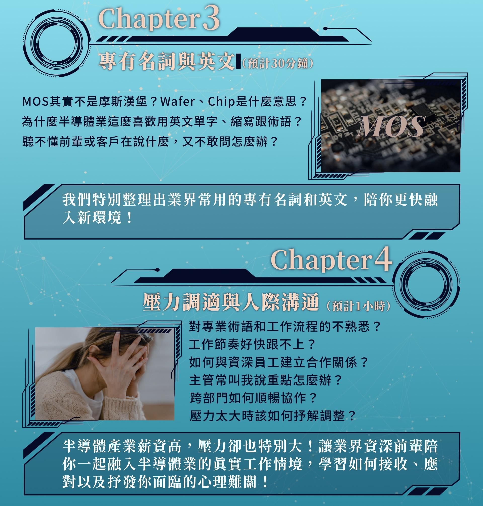 半導體業有一個特殊的溝通生態,會經常使用英文字詞、縮寫跟慣用語,能不能聽懂甚至使用這些英文非常重要,除了展現專業外也是業界彼此的溝通語言。我們也特別整理出業界常用的專有名詞和英文,這對實際工作的互動非常有幫助。