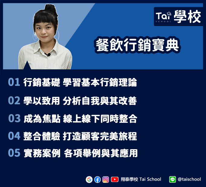 在餐飲市場競爭的道路上,無論是大、中、小型的業者,都在求新求變。市場上越來越多人,要怎麼在各大連鎖品牌、特色小店、老店等夾殺中生存,讓自己的品牌店舖穩健成長,是每位經營者都會面臨到的問題,在這堂課中,我會介紹各類行銷的基本知識,以及如何把「專業套用在店家」上,讓正在經營或未來想創業者都能在產品、宣傳、通路經營等方面上得心應手。