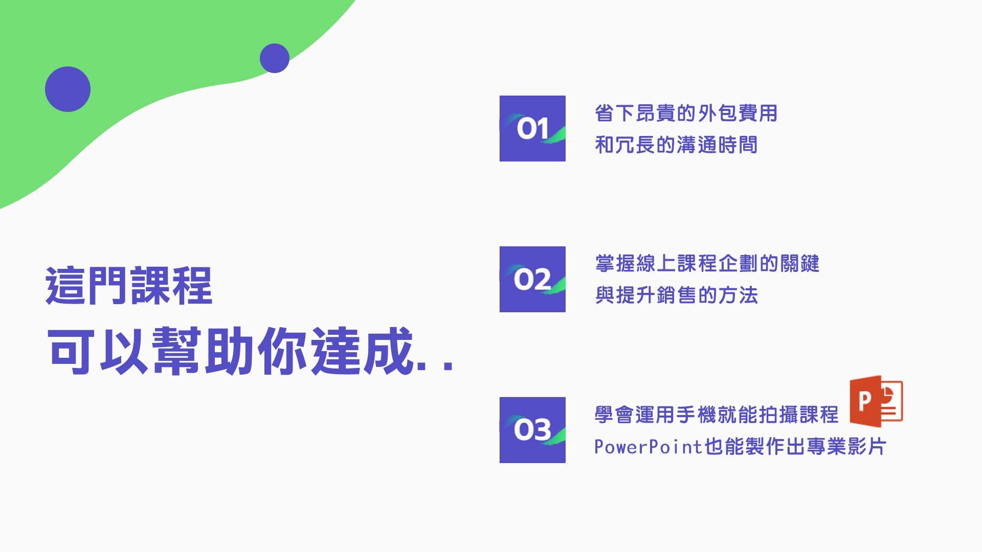 - 學會運用手機就能拍攝課程,用PowerPoint也能製作出專業影片。