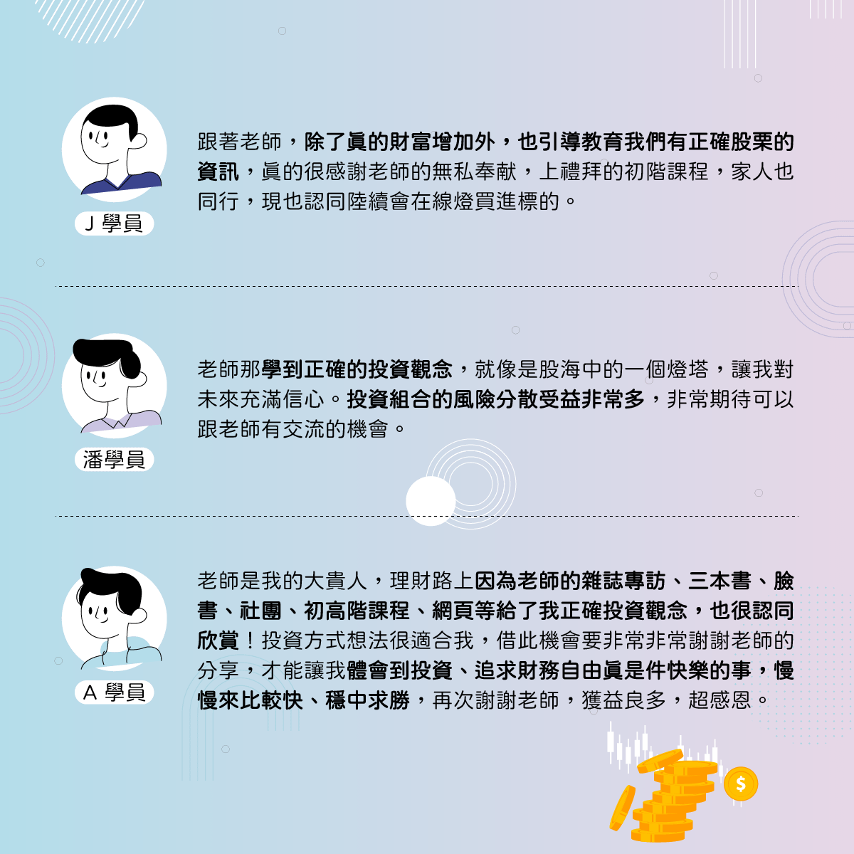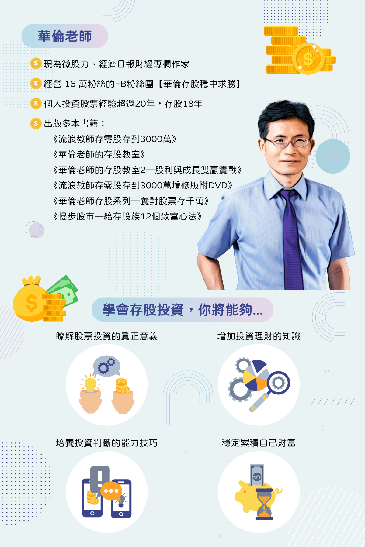 華倫老師的 FB【華倫存股 穩中求勝】粉專中分享許多自身經驗,陪伴許多學員們投資理財並獲得許多好評 點擊看更多。