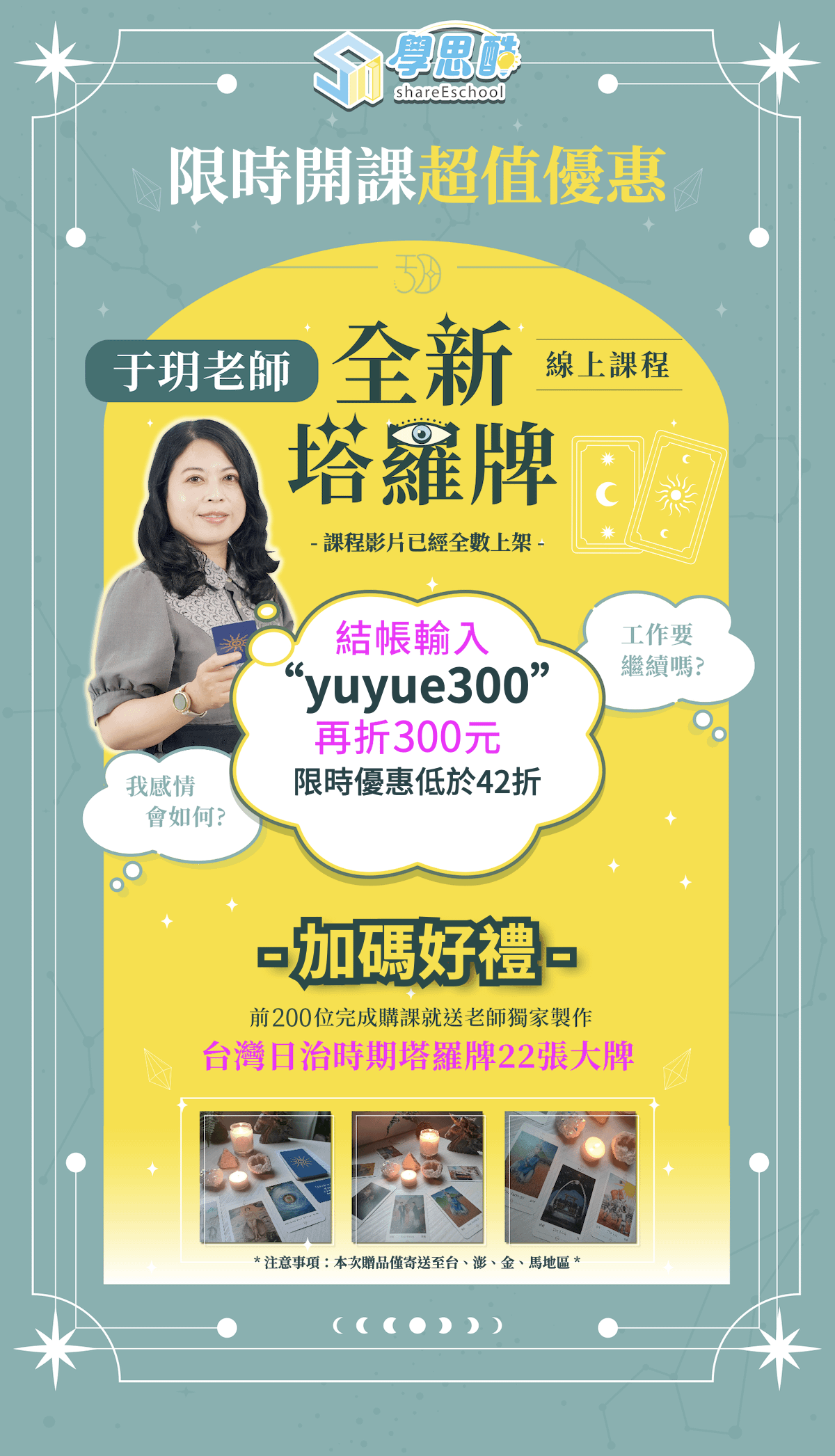 1. 購課成功後,請填寫表單領取講師獨家製作『台灣日治時期塔羅牌22張大牌』👉 https://www.surveycake.com/s/qGa96