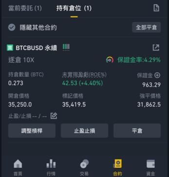 - 保證金:當初掛價交易的本金,逐倉模式下可以點選旁邊的「+」來增加保證金,全倉模式時會將合約帳戶的錢皆視為可動用的保證金,接近強平價格時自動補入。