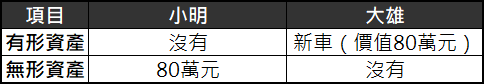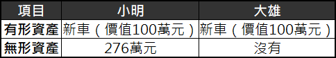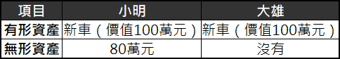 雖然小明比大雄多了現金80萬元(不計利息),但因為一般人只看得到有形資產的部分,所以會認為他們兩人是同樣富有的。