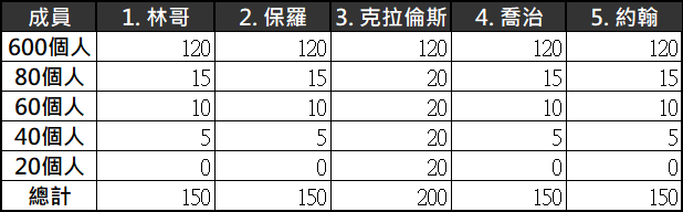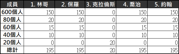 - 60個人組別和40個人組別道理也相同,因為各別認識披頭四的2個成員和3個成員,所以和80個人組別一樣,投票結果克拉倫斯票數會較高一點。